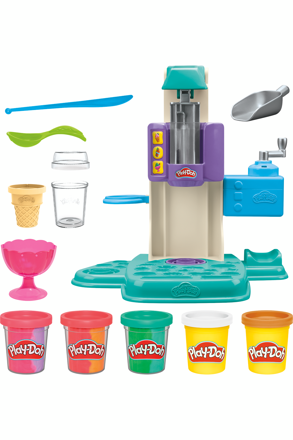 Twirl into imaginative play with the Play-Doh Rainbow Swirl Ice Cream Playset! Load the machine with two or more Play-Doh colours and press the handle to fill the spinning cup or cone with rainbow-edged pretend soft-serve. Create make-believe sprinkles and other Play-Doh food like pretend pretzels, fanciful fruits and crazy candy cups to decorate creations. This toy ice cream set comes with a spoon, a toy knife, a sprinkle scoop, a dish, a cone and a cup with a cover, so children can play pretend ice cream shop and imagine serving up their Play-Doh creations. This Play-Doh kit includes 284 g (10 ounces) of Play-Doh modelling compound, including three dual-colour cans to make multicolour swirls and decorations. Toy kitchen appliances like this Play-Doh kitchen set for children make great presents for 3-year-old children and up.