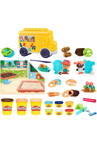 Kids make the rules at school with the Play-Doh School Day Adventures set! They can use the 15 Play-Doh tools, double-sided playmat, and 9 compound colours to create their very own classroom scenes and stories over and over again! Create students, classroom accessories, and other fun shapes with the stampers, cutters, and school bus book-mould. Kids can choose from 2 different scenes with a schoolyard backdrop on one side of the play mat and a classroom on the other. The playmat not only inspires imaginative ideas, but it also helps keep the Play-Doh fun off your table. Whether you're looking for sensory toys, school prizes, or fun gifts for kids, this Play-Doh pack is sure to get an A grade! This set contains 1 book-mold, boy and girl stampers, 1 double-sided playmat, 6 cutters, 1 decorating tool, 1 caterpillar tool, 1 flower bed tool, 1 picnic basket, 1 roller, knife, and 9 cans of Play-Doh