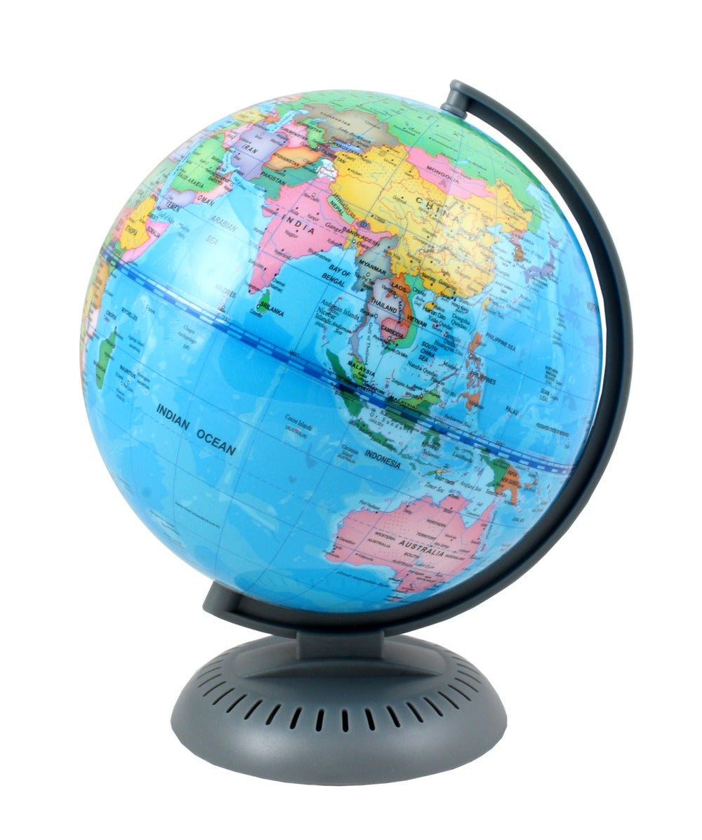 A globe measuring 14cm in diameter and showing the political map of the world. Great for planning future travels or studying geography. Features a plastic stand and a glossy finish.