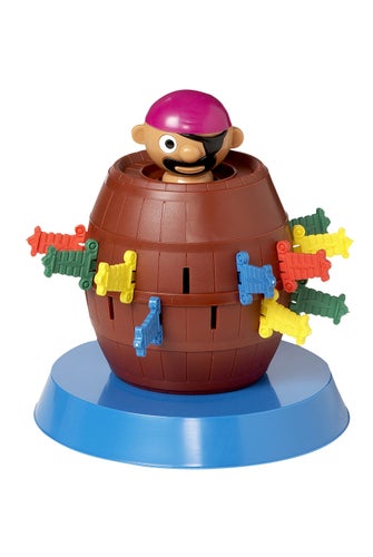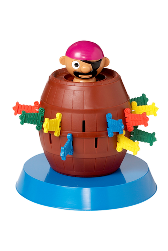 Push the pirate into his barrel, select your favourite colour swords and then take turns sliding a sword into the barrel slots. But beware - if the pirate pops up then you are OUT. The last remaining player is the winner.- Ages 4+