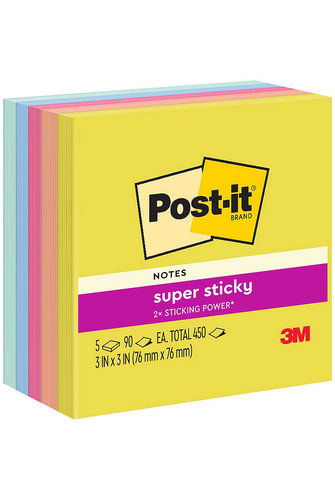 Post-it Super Sticky Notes in 76mm x 76mm size feature 2x the sticking power. Unique adhesive reliably sticks and re-sticks so your message can stay front and centre. Move your notes with you throughout the day. Uplift your spirits and messages with the vibrant, strong colours of the Energy Boost collection. There are 90 sheets per pad. Pack of five pads.