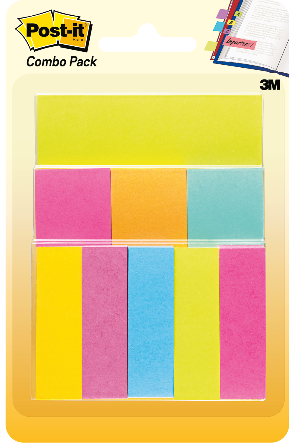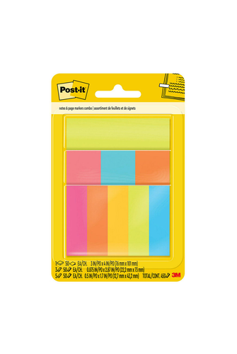 Post-it Notes stick securely and remove cleanly, featuring a unique adhesive designed for use on paper. This combo pack of Post-it Notes comes with 5 pads of 12mm x 43mm page markers, 3 pads of 22mm x 73mm page markers, and 1 pad of 76mm x 101mm notes in bright colours. 100 sheets per pad.