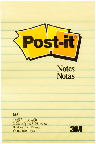 Post-it Lined Notes in 101mm x 152mm size offer enough room to catch the important details. Perfect for to-do lists, messages, and memos. They stick securely and remove cleanly. Original Canary Yellow colour is familiar and attention-getting. 100 sheet pad.