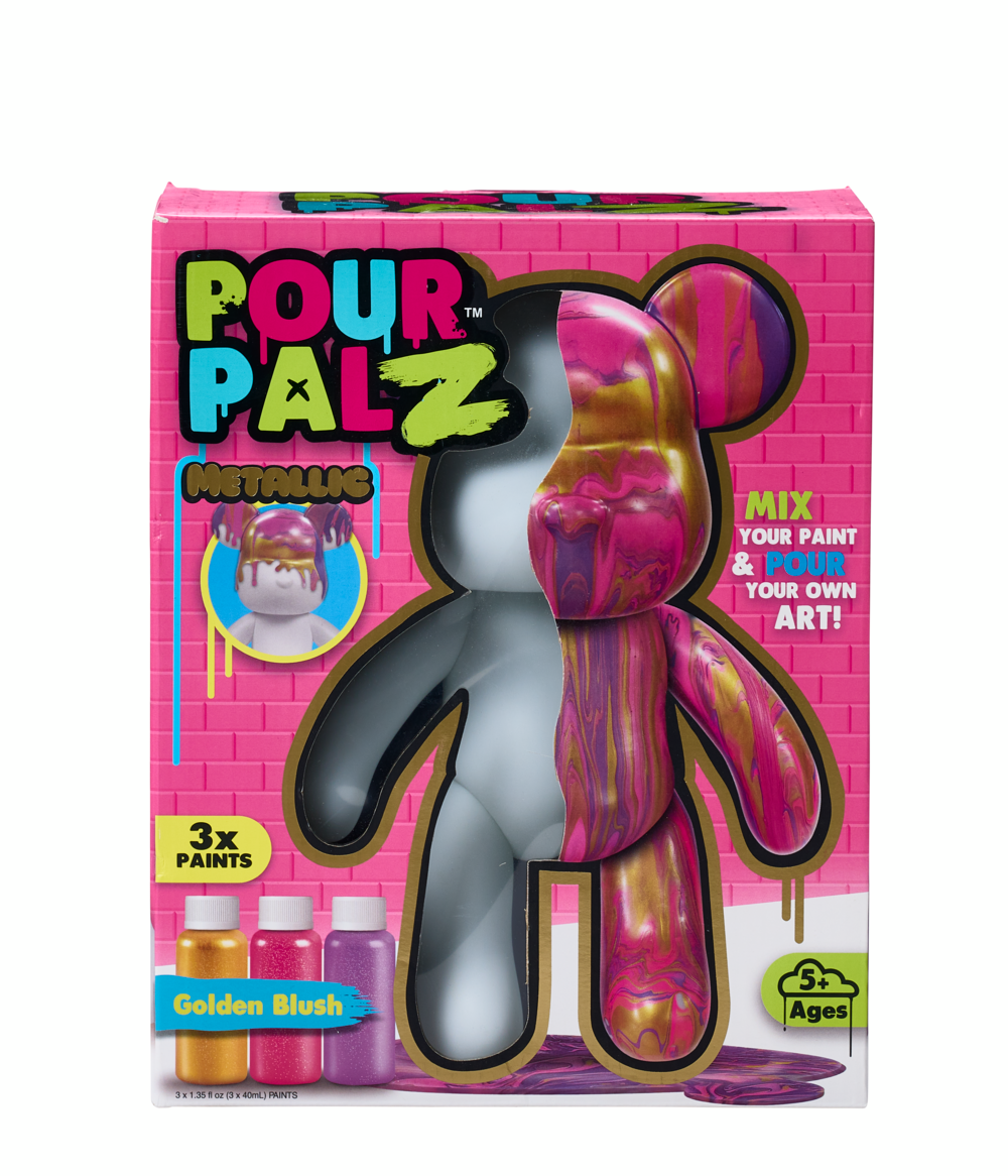 - Contents: 1 posable Pour PalZ Paint Bear, 1 mixing cup, 1 pour spoon, 1 no mess gloves, 1 no mess clean sheet, 3 acrylic paints