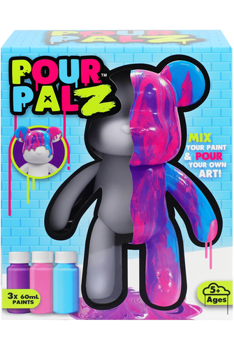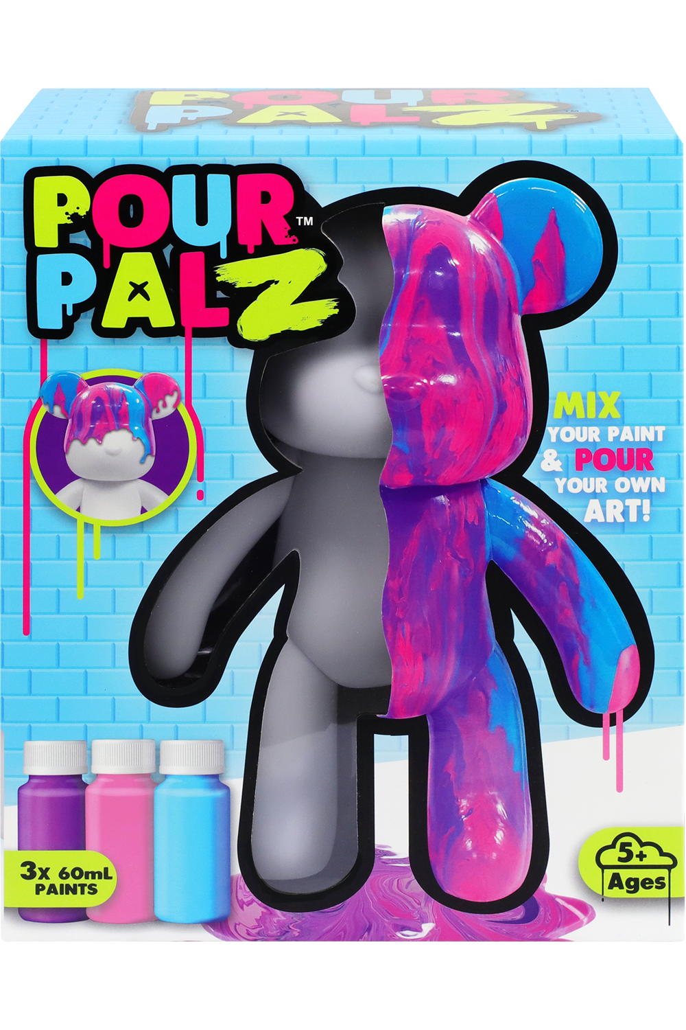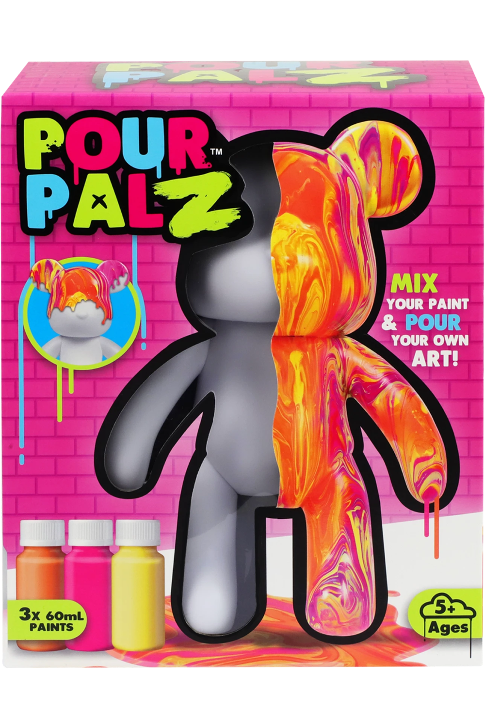 - Contents: 1 poseable Pour Palz character, 3 acrylic paints, 1 pour spoon, 1 mixing cup, 2 no mess gloves, 1 clean sheet