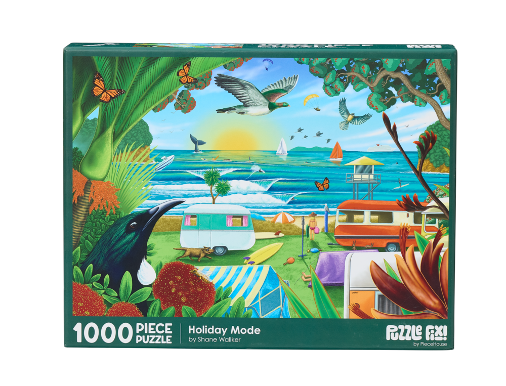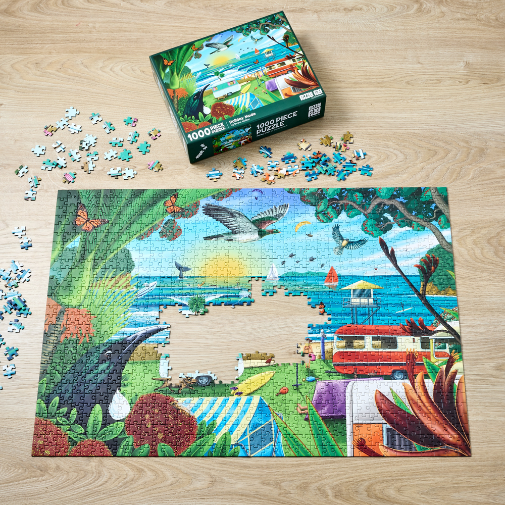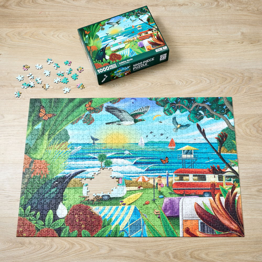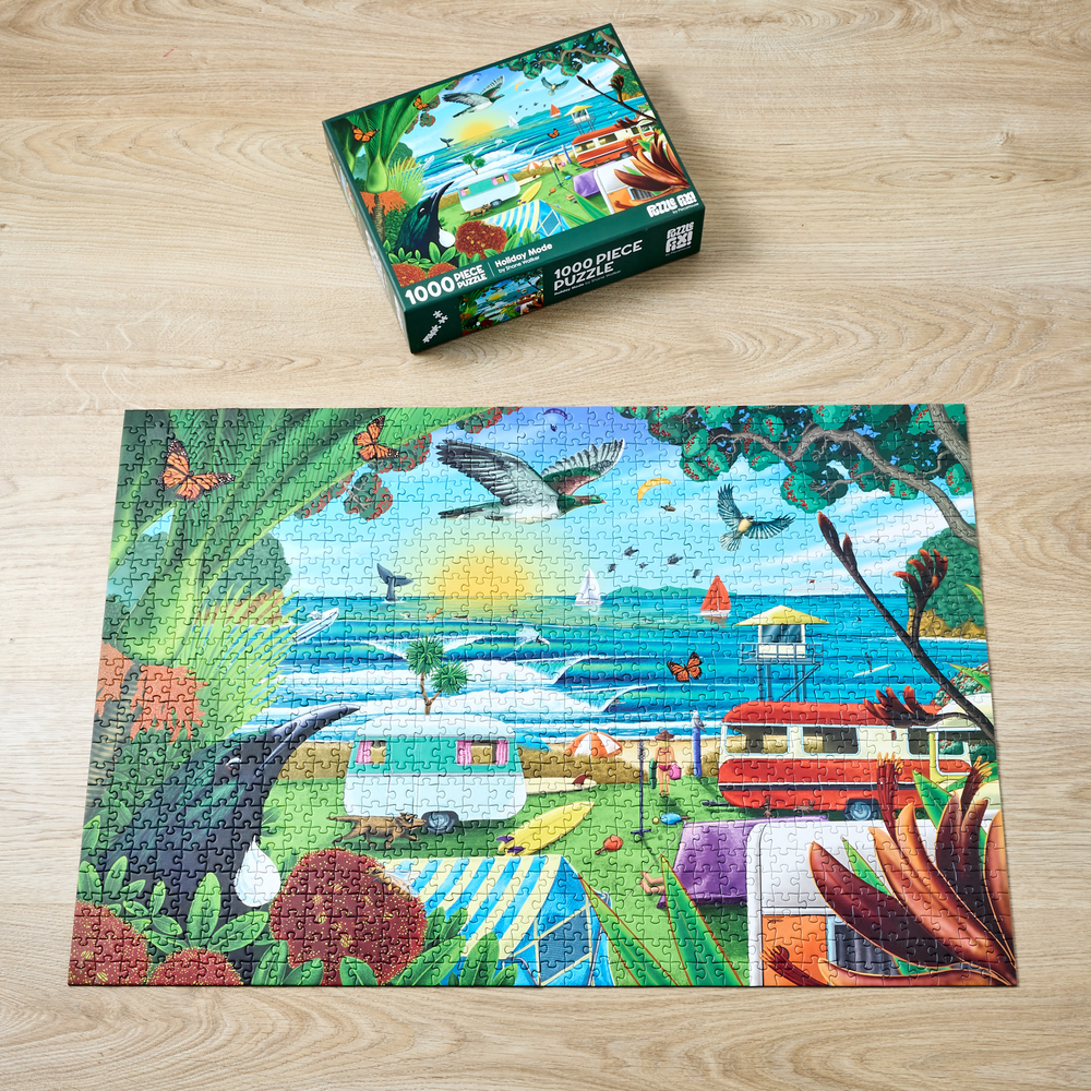 Piece together a wonderful image of a New Zealand beach holiday from artist Shane Walker. Featuring 1000 pieces, when completed you will have a stunning image depicting native flora, fauna, and wonderful scenery. Finished puzzle measures: 75cm x 52cm
