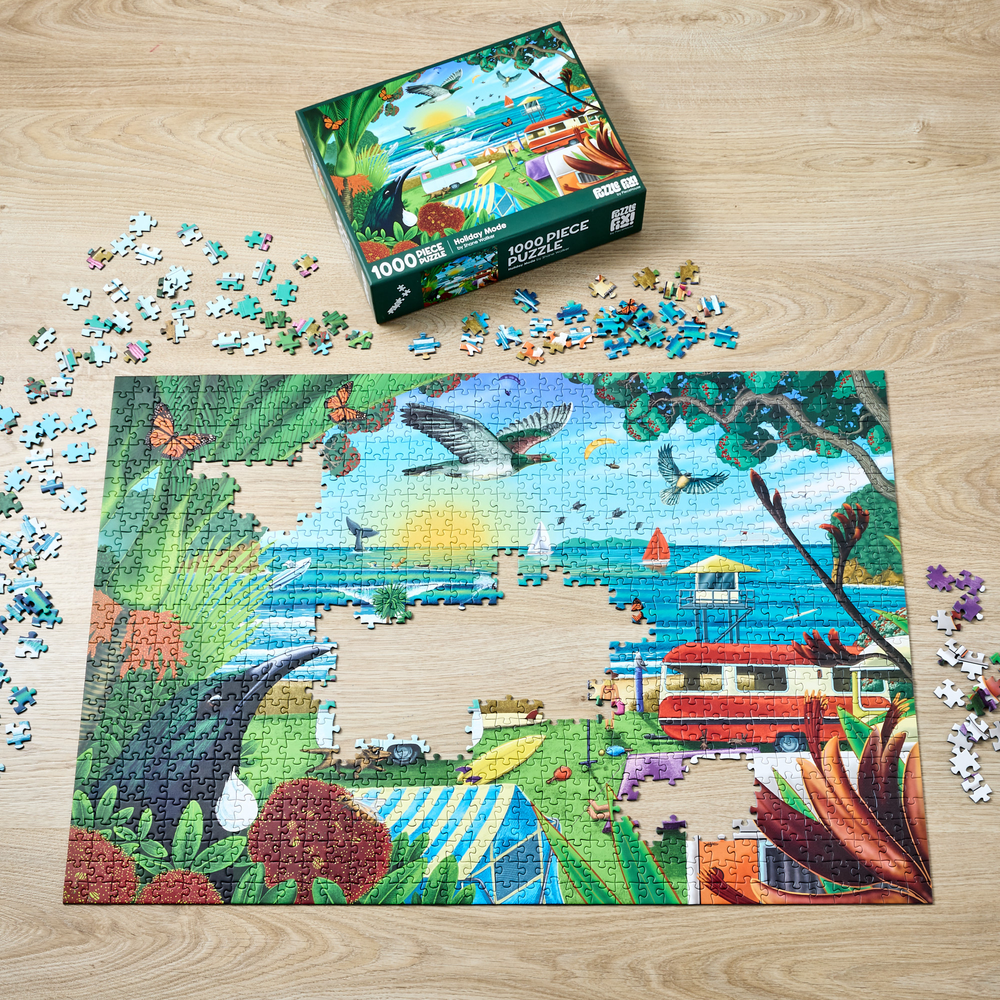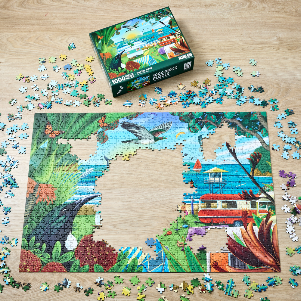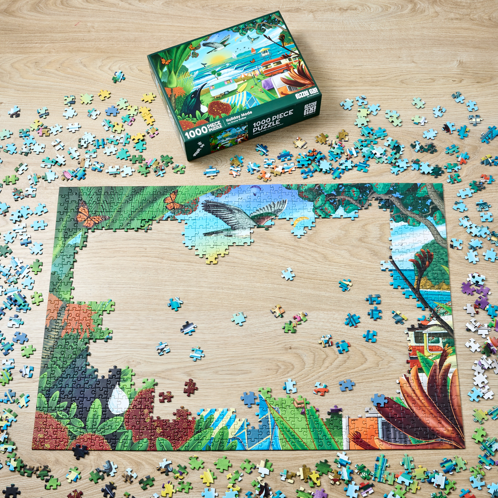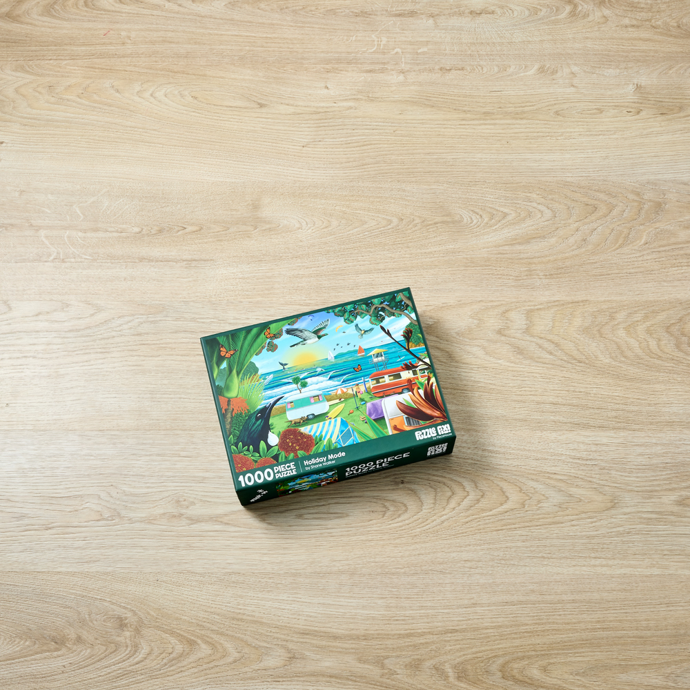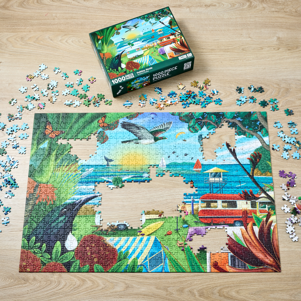 Piece together a wonderful image of a New Zealand beach holiday from artist Shane Walker. Featuring 1000 pieces, when completed you will have a stunning image depicting native flora, fauna, and wonderful scenery. Finished puzzle measures: 75cm x 52cm