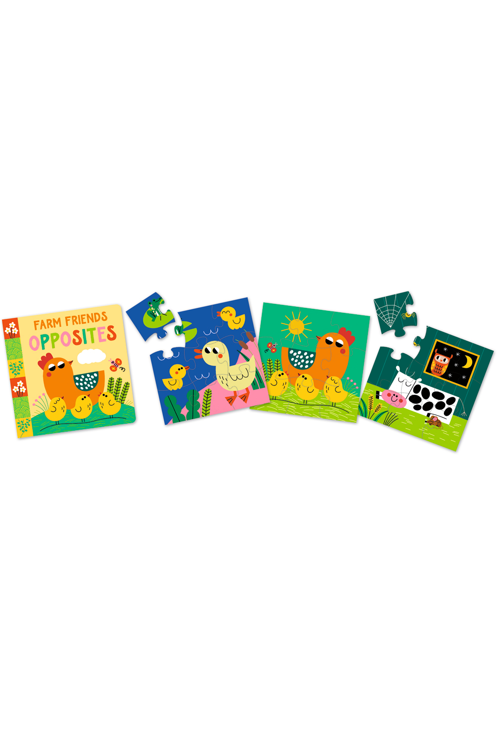 Learn about opposites with this fun book and 3 colourful Farm Animal mini-puzzles. With each puzzle containing 9 chunky pieces, Farm Friends Opposites pieces feature strong visual clues to help children piece together the friendly farm animals.
