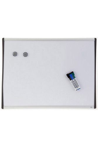 Decorative whiteboard doubles as a magnetic bulletin board to post notes, memos and more Durable stainless steel surface is surrounded by a silver plastic frame.