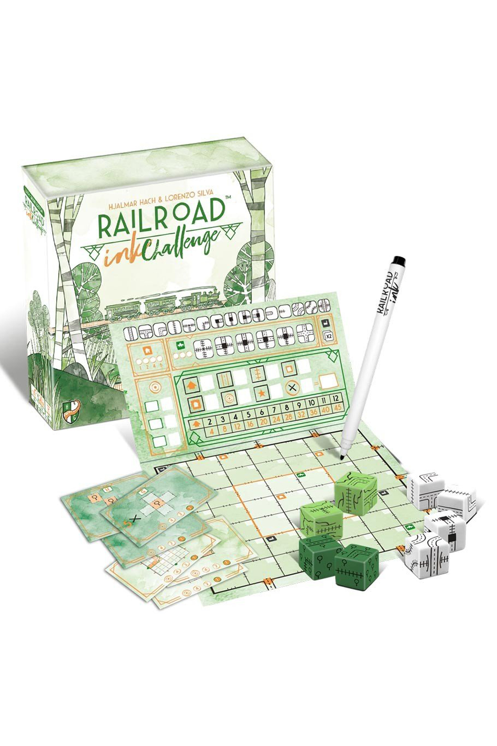 Railroad Ink Challenge is a quick-playing roll-and-write game for 1 to 4 players. Grab a board and a dry-erase marker, and get ready to reach networking nirvana! Roll the dice and draw the routes to connect the exits around your board. Expand your network with railways, highways and stations to collect points, but you will be penalized for any open connections, so plan carefully! Railroad Ink Challenge has everything you love from the original Railroad Ink games and a lot more, with an all-new focus on player interaction thanks to in-game goals! Only those who achieve them first get the reward, so you have to keep an eye on what your opponents are doing and try to complete the goals before they do! A different set of goals is available each time, so no two games will be the same! But wait, there's more! Draw unprecedented, mind-bending route configurations thanks to the new dice! Connect special structures to your network to trigger new effects: factories allow you to duplicate a die, villages give bonus points if they are close to a station, universities unlock extra special routes - use these effects wisely and you'll score big!