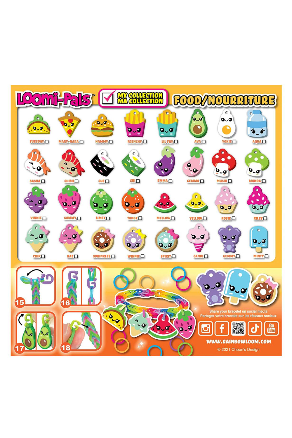 The Loomi-Pals Collectibles feature a resealable bag that gives you the ability to store all your bracelet making tools for when you're on the go. Easy to follow double sided instructions that teach you how to make a fishtail bracelet using the Happy Loom and G-clips. Food Themed Loomi-Pals Character check list to keep track of who you've collected. The Happy Loom is an easy-to-use tool that allows you to loom using only your fingers. Create stunning bracelets using a wide variety of unique and colourful bands. Accessorize your bracelets with our adorable Food Loomi-Pals charms by interlinking them with our G-clip. Hook em', bedazzle, and share your Loomi-Pals bracelets with your friends! Collect them all!