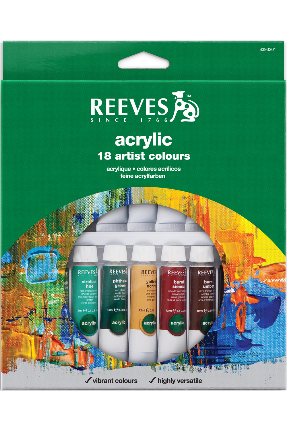 A pack of 18 carefully curated acrylic 10mL paint tubes by Reeves. Brighten up your world with pigment-rich, water-based colour that's more than a match for virtually any surface. You choose a brush or palette knife and cover paper, fabric, and more with colour-packed creativity. Be strong, be vibrant, be daring. But never be ignored. Reeves Acrylic Colours are quick drying and water based. Suitable for a variety of different techniques and surfaces (canvas, paper, wood, fabric), their versatility makes them popular with many artists. Colours are made with high quality pigments and offer a smooth, buttery consistency, good tinting strength, solid coverage, and strong light-fastness.