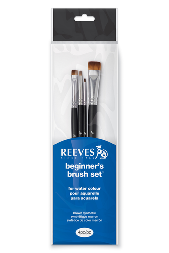 A pack of 4 short Reeves paintbrushes for watercolour paints in varying shapes and sizes. Essential art brushes specially designed to work wonders with your chosen Reeves watercolour paint to give maximum control over line and weight. Made with brown synthetic filament. Contains a round 1 brush, a round 6 brush, a flat 4 brush and a flat 8 brush.