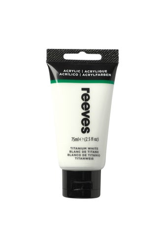 A 75mL tube of Reeves acrylic paint in titanium white. Brighten up your world with pigment-rich, water-based colour that's more than a match for virtually any surface.