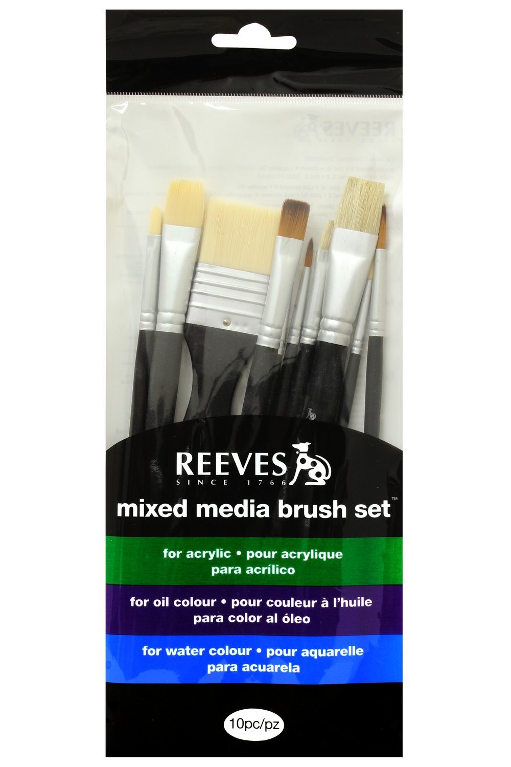A pack of ten Reeves paintbrushes for use in acrylic, oil and water colour painting. Essential art brushes specially designed to work wonders with your chosen Reeves oil, acrylic, or watercolour paint to give maximum control over line and weight. For acrylic paintings, the pack includes cream synthetic brushes in size 2 round, size 8 flat, size 4 filbert, and size 30 spalter styles. For oil paintings, the pack includes natural hog bristle brushes in size 2 round, size 10 flat, and size 4 filbert styles. For water colour painting, the pack includes brown synthetic brushes in size 3 round, size 6 round, and size 6 flat styles.