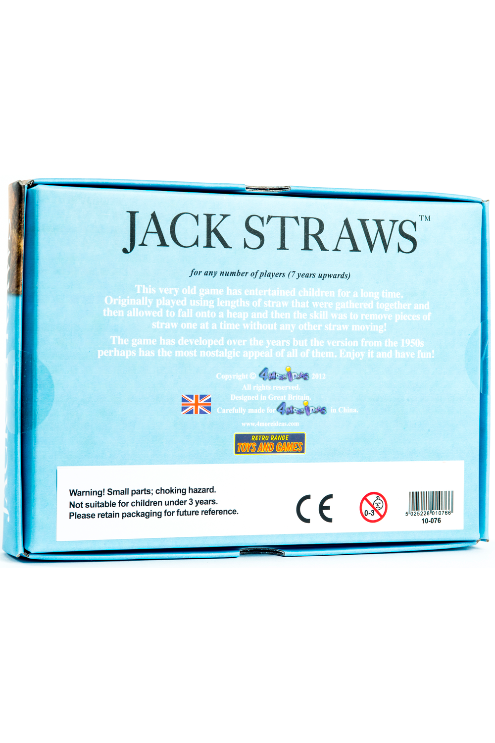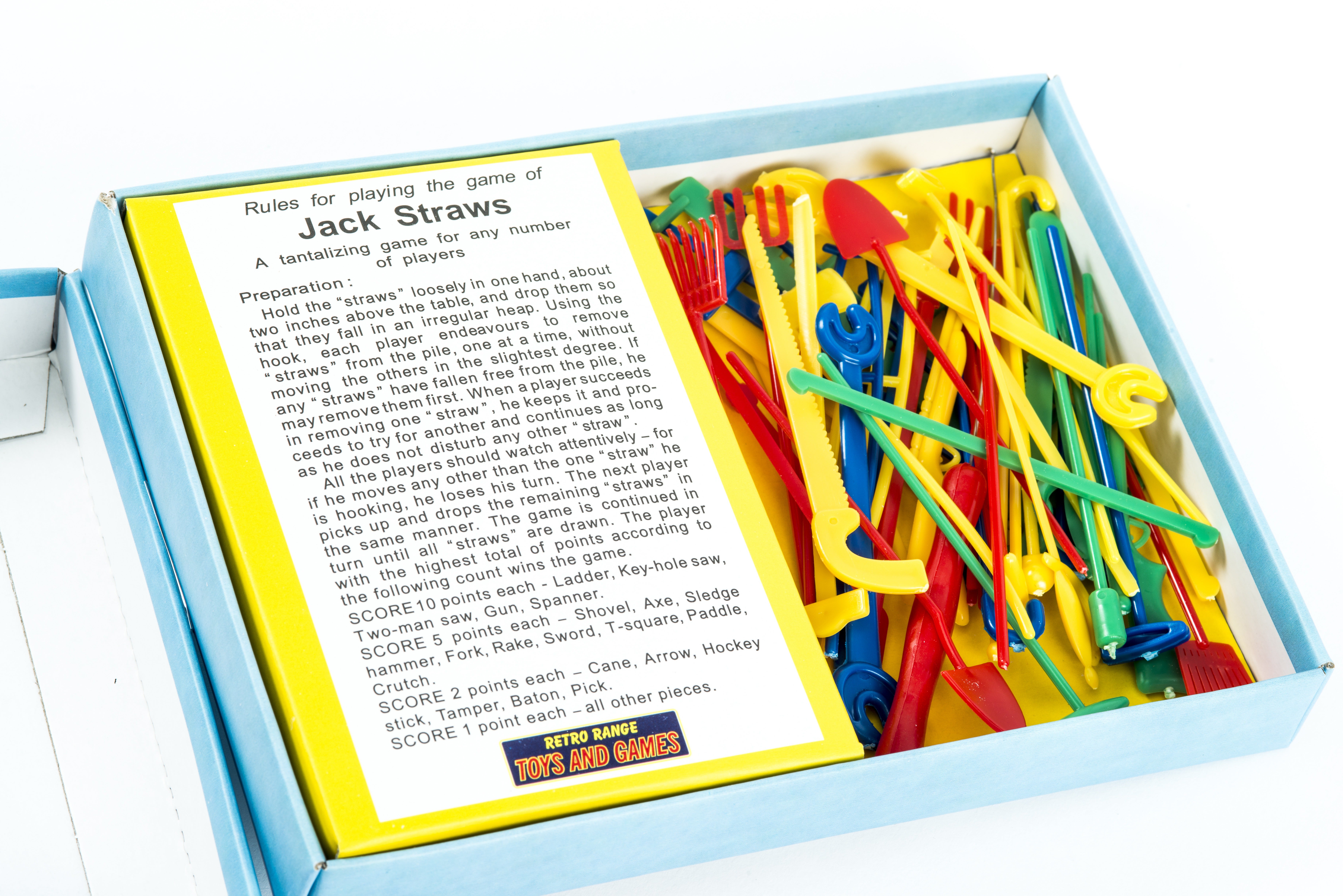 Retro Range Toys and Games Jack Straws is a traditional game presented in a 1950's style. This very old game has entertained children for a long time. Originally played using lengths of straw that were gathered together and then allowed to fall onto a heap, the skill is to then remove each piece of straw one at a time without moving any of the others. This game is still known as pick up sticks. Jack Straws has been developed from this and now the 'straws' have been replaced by items that represent trades like a rake for a gardener or an oar for a fisherman (Jack of all trades). The level of difficulty is stepped up because of the irregular shapes which can catch on each other.