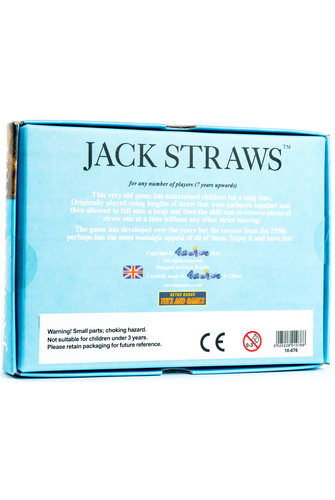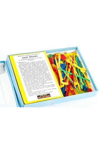 Retro Range Toys and Games Jack Straws is a traditional game presented in a 1950's style. This very old game has entertained children for a long time. Originally played using lengths of straw that were gathered together and then allowed to fall onto a heap, the skill is to then remove each piece of straw one at a time without moving any of the others. This game is still known as pick up sticks. Jack Straws has been developed from this and now the 'straws' have been replaced by items that represent trades like a rake for a gardener or an oar for a fisherman (Jack of all trades). The level of difficulty is stepped up because of the irregular shapes which can catch on each other.- Ages 7+