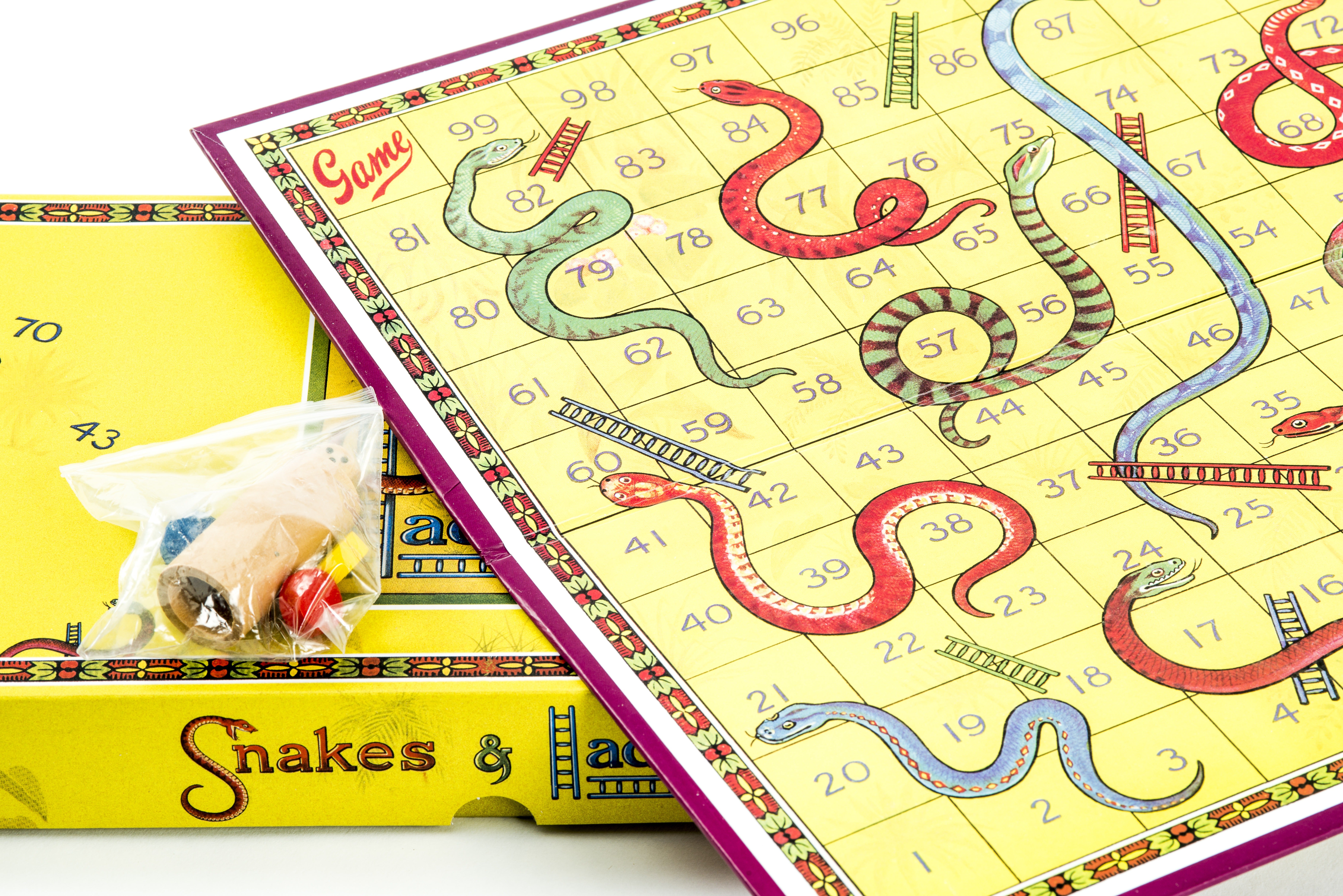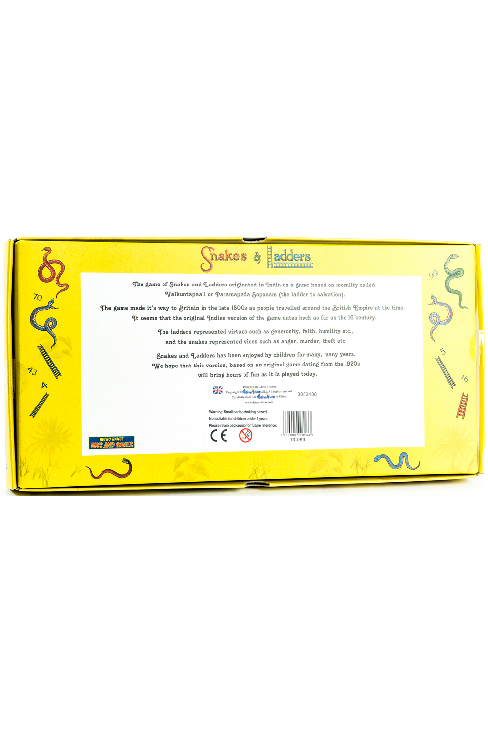 The game Snakes and Ladders originated in India as a game based on morality called Vaikuntapaali or Paramapada (the ladder to salvation). The game made its way to Britain in the late 1800's. The ladders represent virtues such as generosity, faith, and humility. The snakes on the board represent vices such as anger, murder, and theft. Snakes and ladders has been enjoyed by children for many, many years. This version the Retro Range Toys and Games Snakes & Ladders is a traditional board game presented in a 1920's style. It will bring hours of fun as it is played today. Contents include: 4 Counters, 1 die, Game board, and instructions.