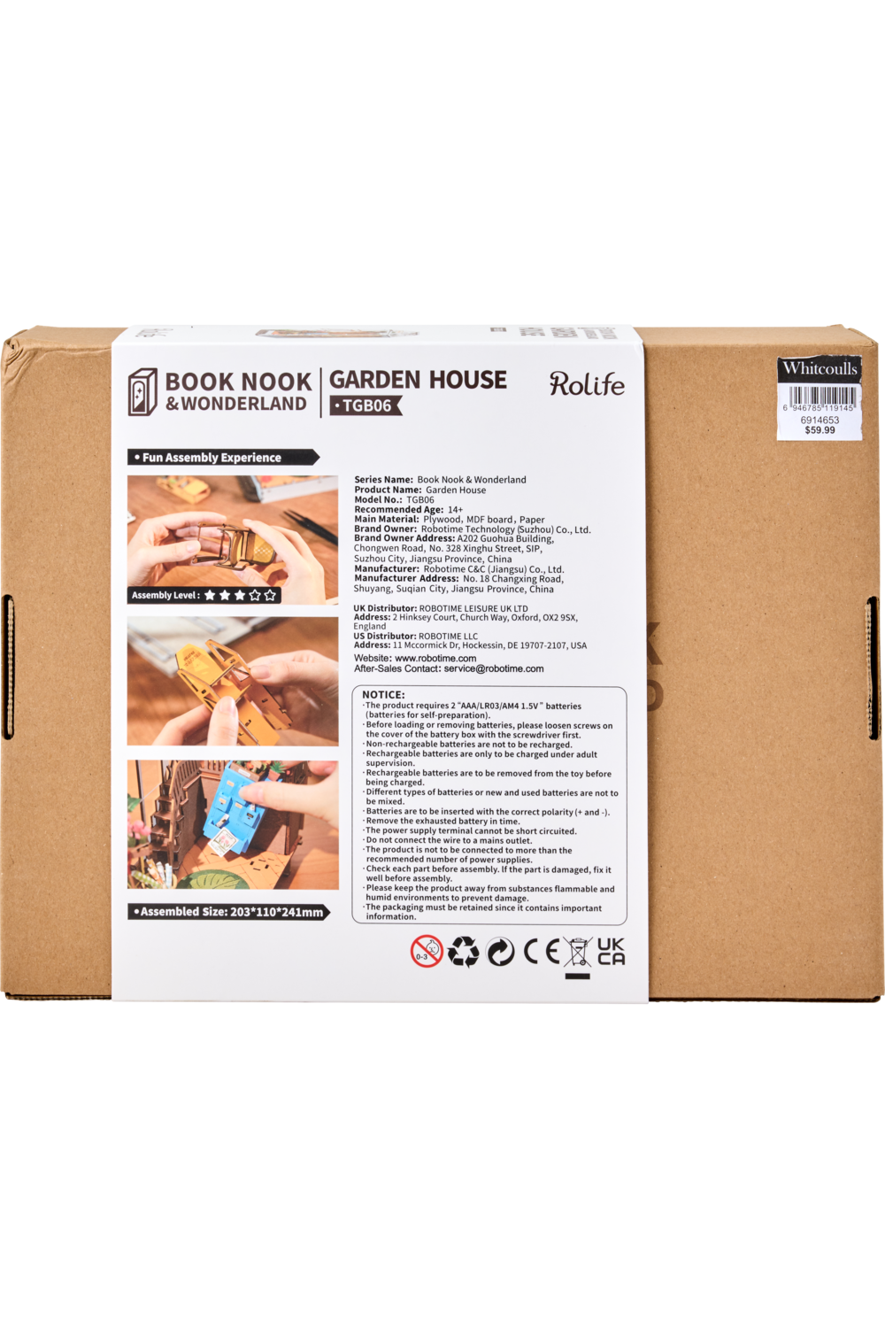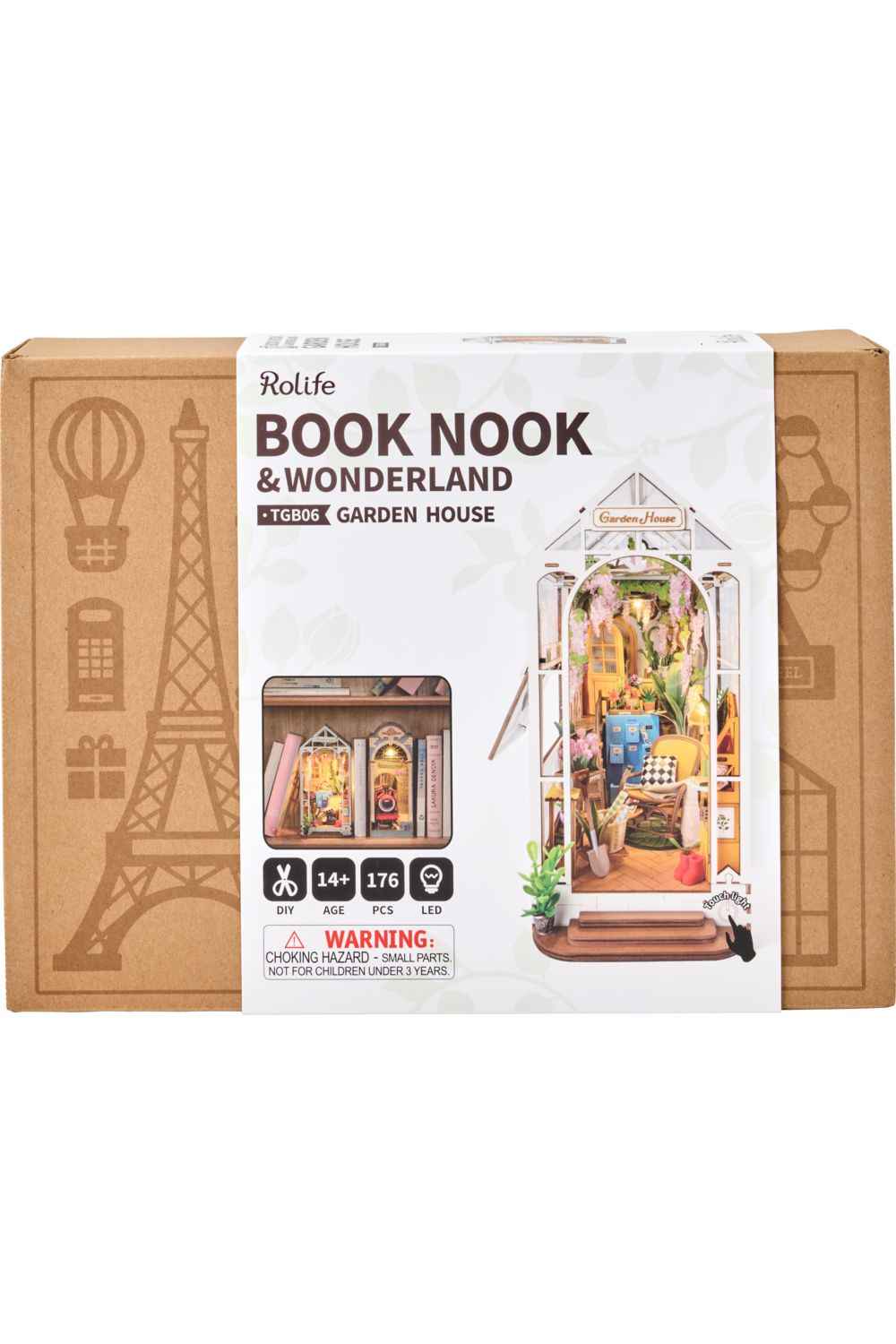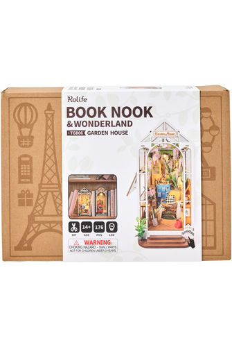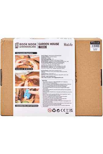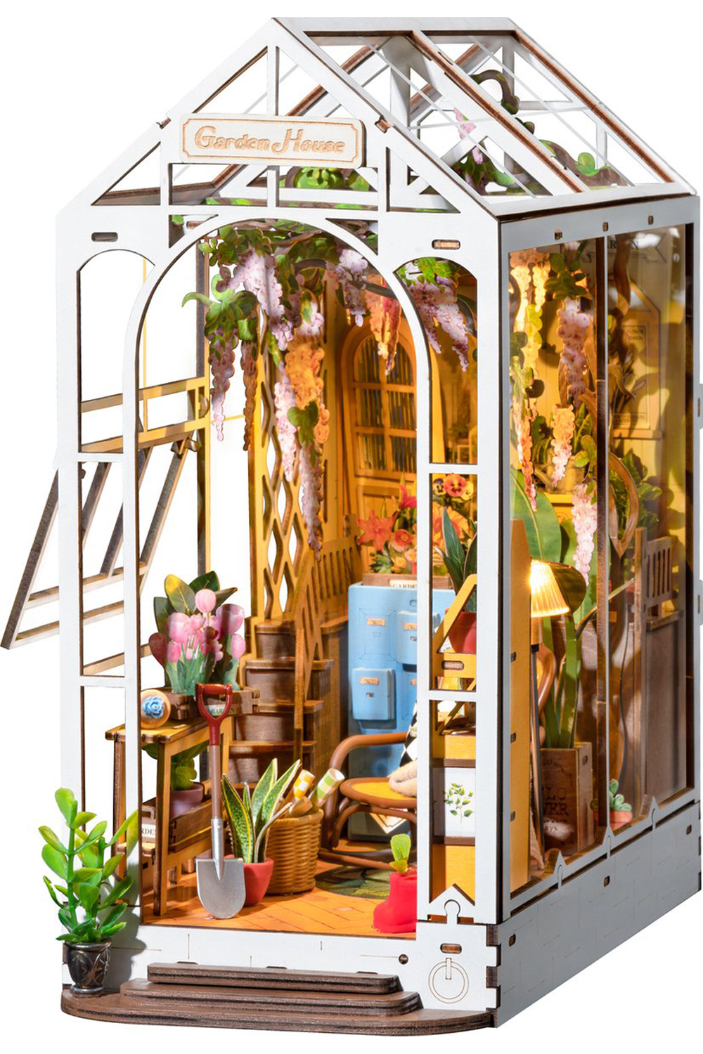When you step into this garden house, it feels like entering a different dimension. There, adorned with a French archway, the glass radiates dreamy colours, resembling a vibrant artwork that elevates the romantic atmosphere to its peak. Inside this flower house, you will discover a unique oak rocking chair crafted in a rustic and minimalist medieval style. Indulge in the beauty of 14 different types of flowers and embrace your green thumb with the inclusion of a variety of tiny plant tools. The assembly process of the Holiday Garden House is a joyous journey. The easier difficulty level ensures a fun and engaging experience, while the mortise and tenon process guarantees a closely connected and stable structure. The side window can be opened with a simple push outwards. Surrounding the windows is a beautiful wisteria vine, adding a touch of natural elegance to the space. The touch-sensitive night lights softly illuminate the surroundings.