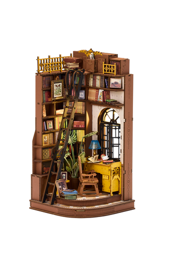 When the world gets loud and tiring, find solace in Rolife's peaceful book nook, the Silent Corner Study. Discover the warmth of this unique place. The Rolife silent corner desk is your personal retreat, a cozy reading space that captures the magic of old-fashioned bookstores and family libraries. Immerse yourself in this little world and let yourself be carried away by creativity and freedom. With its vintage desk, charming lamp, and cup of your favorite beverage, your comfortable rocking chair is ready to welcome you for a few hours while you build this DIY shelf unit. This little corner is cleverly used, with books stacked high on each shelf. Each volume is accessible via a tall ladder, and the space is well ventilated thanks to the French window adorned with a classic red curtain. The puzzle itself is an easy and relaxing construction, further highlighting the soothing hobby that Rolife promotes.