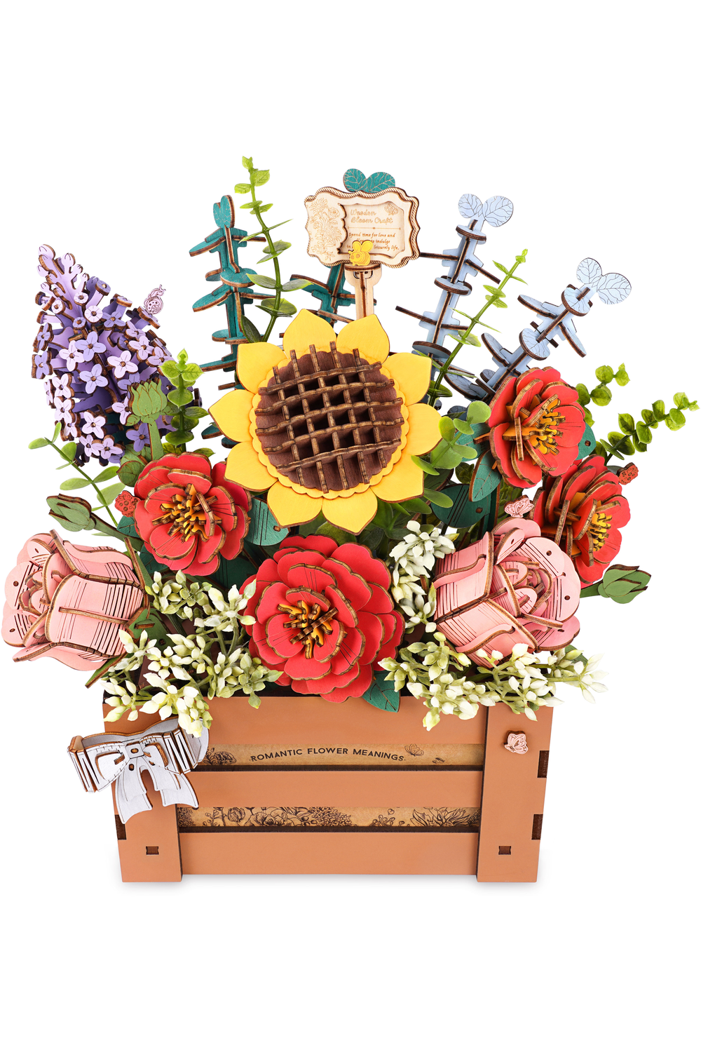 Create a timeless beauty that won't wilt or fade with the Wooden Bloom Box. Enjoy the building process of putting together each bloom, petal by petal, stem by stem, while contemplating the uplifting symbolisms of the flowers. Then unleash your inner florist and arrange them how you see fit. The choice is yours.#The Wooden Bloom Box features a gorgeous mix of floral pieces like sunflowers, pink roses, red camellias, and lilacs in amazingly lifelike elegance. These were handpicked not just for their beauty but for the positivity, grace, and resilience that they stand for. #Enjoy hours of relaxing, fulfilling fun as you assemble this kit. Then display it on any surface where a real floral arrangement might wilt.