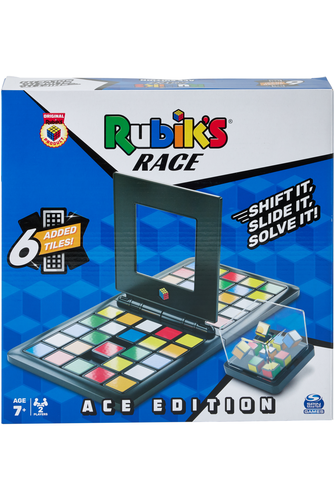 Rubik's Race: Ace edition is a fast-paced sequence board game that is designed to get your brain and fingers racing. Shake the scrambler and take your opponent on head-to-head. Shift and slide the tiles to become the first racer to match the 3x3 centre of the scrambler's cube pattern. But beware - your opponent may put in blockers or wild tiles to stop you in your tracks! Although it may sound easy, the Rubik's Race board game is something of skill, speed, and dexterity. Challenge your friends and family to the Rubik's Race and come battle for the pole position. Be the first to drop the divider frame on their completed side of the board. Can you handle the pressure of the Rubik's Race? This new version of the Rubik's Race game has six added tiles and an added layer of complexity, making it the perfect gift for any Rubik's enthusiast in your life!