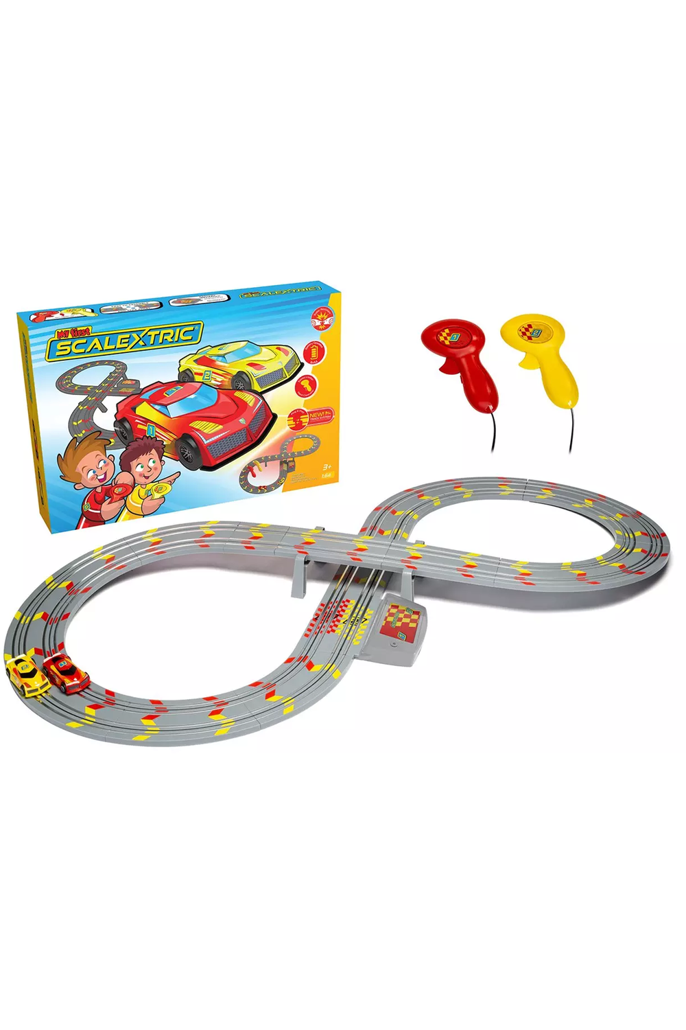 A great introduction to the world of Scalextric featuring an easy-to-assemble figure-of-eight track. This set is the ideal starting point for younger drivers. The two sci-fi cars and adjustable power hand-controllers are colour coded in red and yellow to match chevrons on the circuit. This set is battery operated