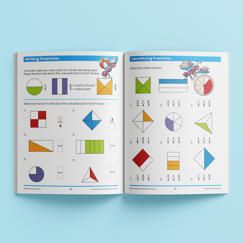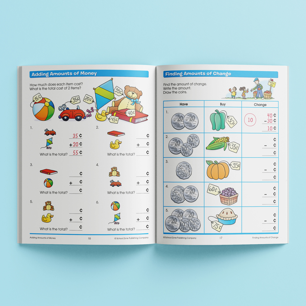 This School Zone Time, Money & Fractions workbook focuses on counting and comparing amounts of money, understanding fractions and telling time. These challenging but vital mathematical concepts for 6-8 year olds are presented in a fun and relatable way. Each lesson builds children's confidence on adding and counting coins, understanding fractions, telling the time, finding elapsed time and identifying congruent parts.