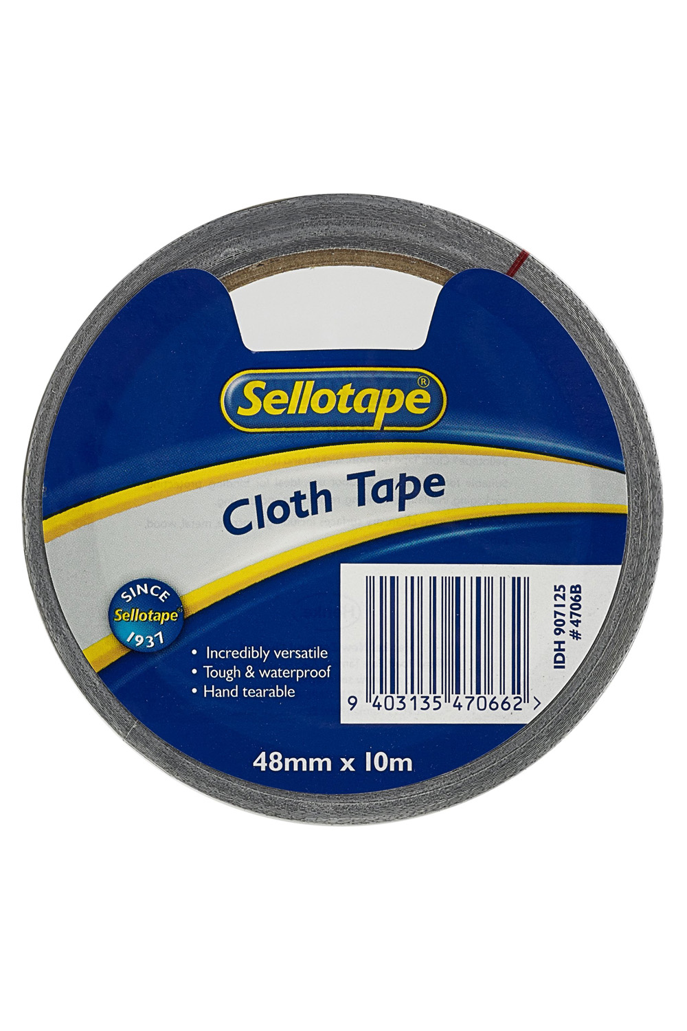 Sellotape 4706 Cloth Tape has a mid-weight rayon cloth backing, laminated with a polyethylene film and coasted with a pressure sensitive rubber adhesive. Suitable for a multitude of applications from general purpose sealing to booking binding and use as a Gaffer/Duct tape. it is water resistant with a wipe clean surface, has high conformability and is hand tearable. Roll measures 48mm x 10m.