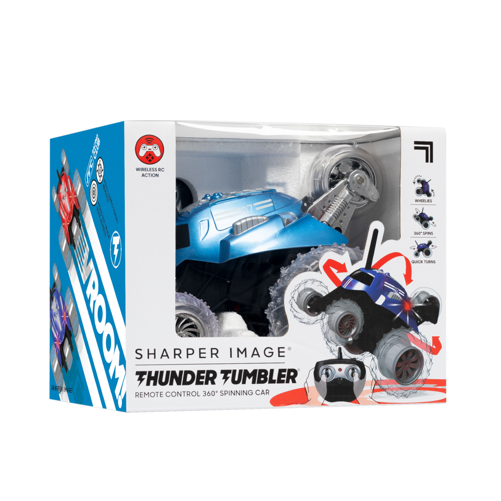 Race in style with the Sharper Image Thunder Tumbler, which brings classic style and speed to an original RC race car design! Kids will love the unique look of this stunt-performing mini truck. The Thunder Tumbler features a race car/mini monster truck hybrid design that's perfect for both racing and doing stunts! It's compact enough to be kid-friendly, too. It's the perfect Christmas or holiday gift! Perform wheelies, 360-degree spins, flips, stunts, and more! The powerful motor ensures exciting high-speed action for kids. The unique dual joystick remote features left and right control. Each joystick independently operates the left or right side of the car at turbo speed, making it easier to flip and spin!