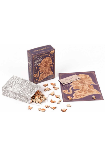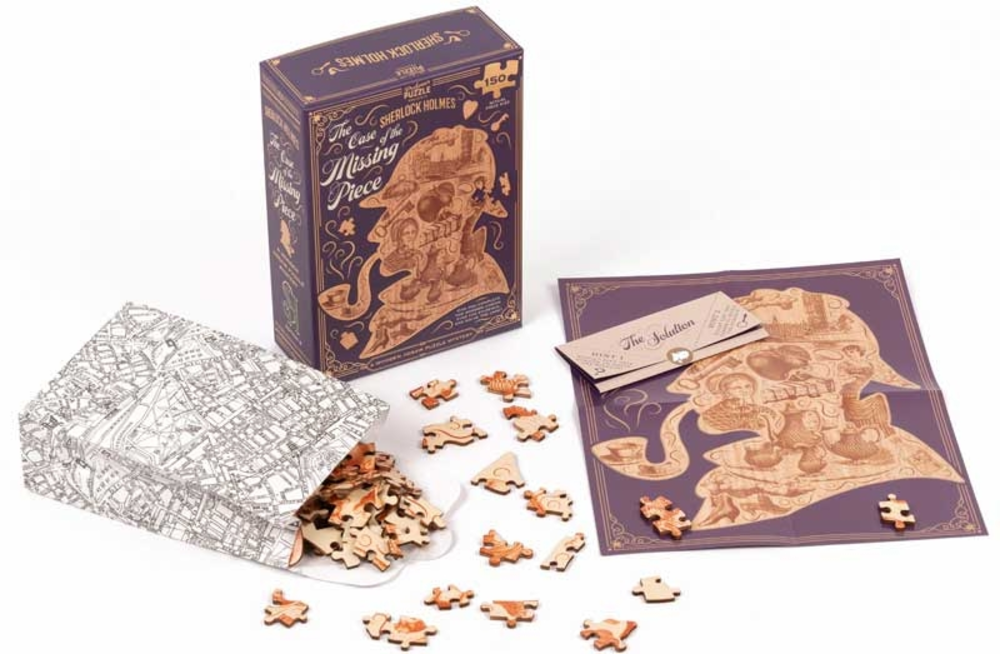 As the sun rises over the London skyline, yet another web of unresolved villainy waits to be untangled. Sherlock Holmes must journey from 221B Baker Street to Westminster to offer his insight on a most peculiar case. While the facts and motives seem ironclad, one minor detail has eluded all of Scotland Yard; exactly how was the murder committed? In this innovative new wooden jigsaw puzzle, standard puzzle pieces fit together alongside uniquely-shaped 'evidence pieces' representing the facts of the case. Build the puzzle, find the evidence pieces, then fit them together to reveal the missing piece and solve the mystery.