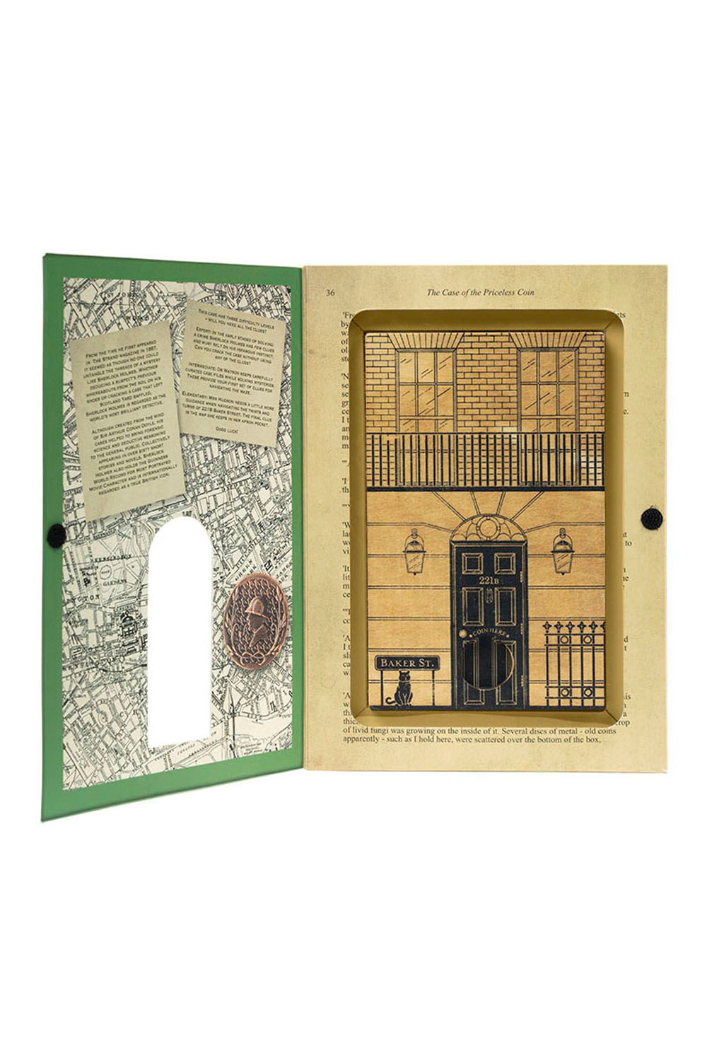 - Contents: Sherlock Holmes coin, a wooden coin maze, case files, solution