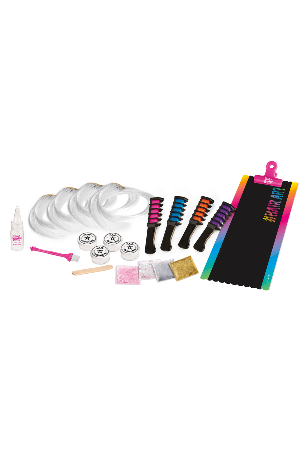 Create Bold and bright colour and glitter hair extensions with the Shimmer 'n Sparkle Colour FX Hair Extensions Studio. Features four vibrant hair colour chalk combs and sparkling glitter gel to create amazing hair designs. Also includes a clip and colour design board to help as your colour your hair extensions. It's safe and washable hair painting fun! Clip the hair extensions to the design board, choose your hair chalk colour then simply comb through to create your colour effect. Mix and match colours to create different styles. The hair extensions are reusable, and colour can be washed out easily so you're ready to create even more amazing looks. Hair colour chalks work great on real hair too. Use the glitter gel to add a pop of shimmer and sparkle to your hair extension. Also includes a sheet of sparkling hair jewels for extra bling. Simply peel off and attach directly to hair for a totally shimmering finished look. Once you have added your hair extensions, style your hair to create your own unique look. From tousled waves to perfect French plaits there's no limit to the styles you can create to show off your new colourful locks. The Colour FX Hair Extensions Studio is the perfect present for children who love all things beauty. They can become real hair stylists and will love creating colourful hair designs on themselves and friends alike.