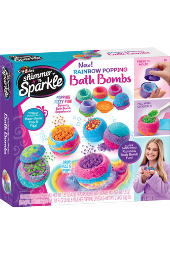 Get ready for popping fizzy fun with the Shimmer n' Sparkle Rainbow Popping Bath bombs! Make vibrant rainbow scented bath bombs then hear them pop and fizz as they create amazing rainbow swirls! Its total rainbow bath bomb fun! Making Rainbow Popping Bath Bombs is so easy - simply press, mould and fill. Use the moulds includes to create the base and lid of your bath bomb, then once dry fill it with magic popping crystals. Add the lid and your bath bomb is ready to use! Now you're ready for some fizzing rainbow swirls! Rainbow Popping Bath Bombs is a magical sensory bath bomb experience! Drop, fizz and pop! Super satisfying! Hear them pop and fizz. Watch the beautiful rainbow swirls when your bath bomb hits the water and smell the delicious scents for a total sensory bath time experience! Mix and match different bath bomb colours and crystals to create a variety of super colourful designs. Create a bath bomb that's totally your style! So many different combinations to explore and create. You can mix the powder colours to create even more rainbow colours!