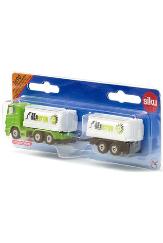 When the fuel gauge is in the red, it#s high time for the SIKU cars, trucks, tractors, and buses to make their next fuel stop at the SIKUWORLD petrol station. The petrol station is supplied by the new SIKU energy tanker: a three-axle tank truck with a bright green cab and a tandem trailer with a tank superstructure made of plastic.