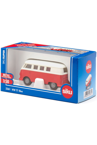 The T1 from Volkswagen is more than a vehicle - it#s a legend! The success story of the German minibus started back in the 1950s, and its German fans lovingly call it the "Bulli". It was a symbol of the German economic miracle, and in the USA it was a cult item with hippies. Thanks to its rounded design, shining paintwork, and chromed bumpers, with its vintage character it still charms a sizeable fanbase today. As a siku model, the cult VW T1 minibus is of course available in the unmistakable white/red colour combination with true-to-original wheels. The bodywork and doors are metal, and the superstructure is plastic. Two doors can be opened on the right hand side of the vehicle. Its trailer coupling allows the T1 to be combined with many trailers.
