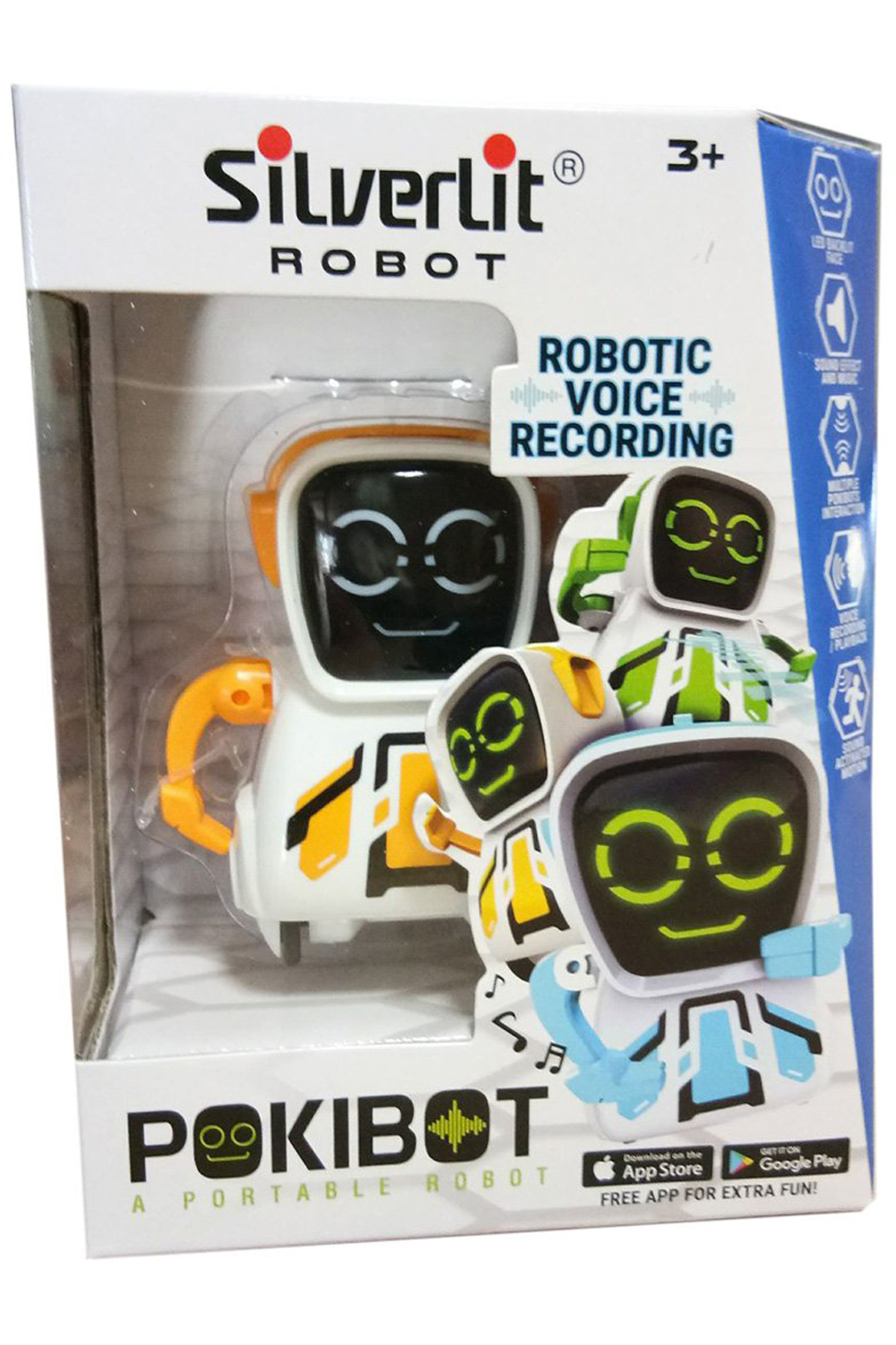 A Portable Robot with more than 6 features! Robotic voice playback and the Sound Activated Motions bring POKIBOT to life with personalities. Features: 3 styles of Robotic Voice Playback, Responds to clapping, Pokibots can interact with each other, Includes free iOS & Android app for extra fun! Assorted designs available.