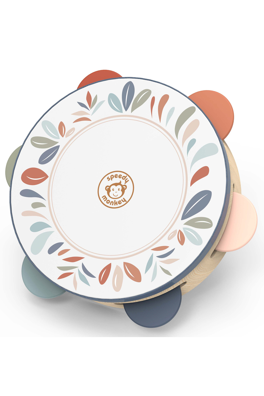 This tambourine produces a fun and vibrant sound that is a favourite for children to dance to the rhythm. It features a decorated drumhead lined with a blue ribbon and 6 pairs of colourful chrome jingle sets. Helps develop little ones' sense of rhythm, motor skills, and musical awareness. This toy is crafted from sustainably sourced wood from FSC certified forests and coated with non toxic paint.