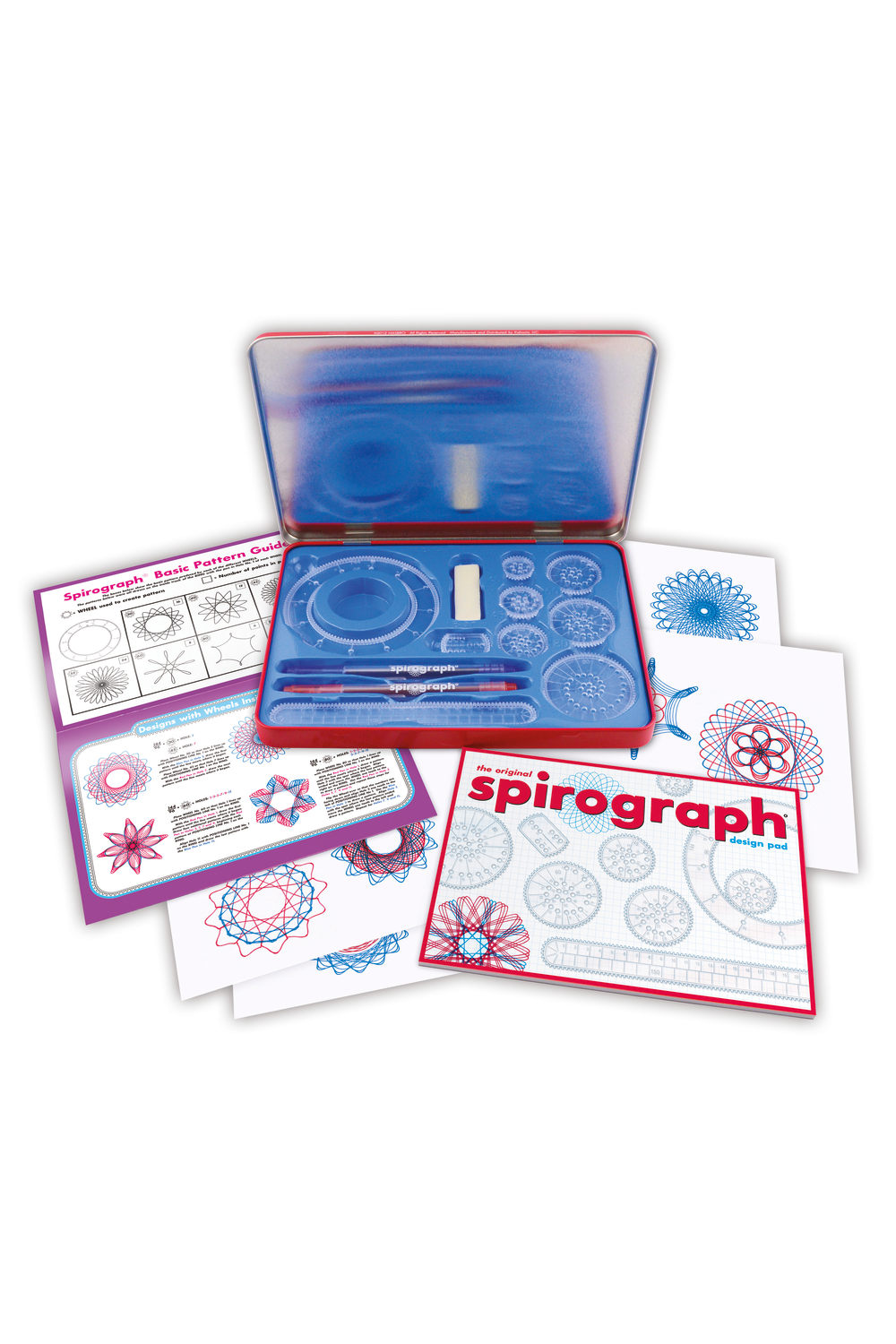 - Contents: Spirographs, 2 design pens, design guide book, Spiro-Putty, storage case, 24 sheets paper