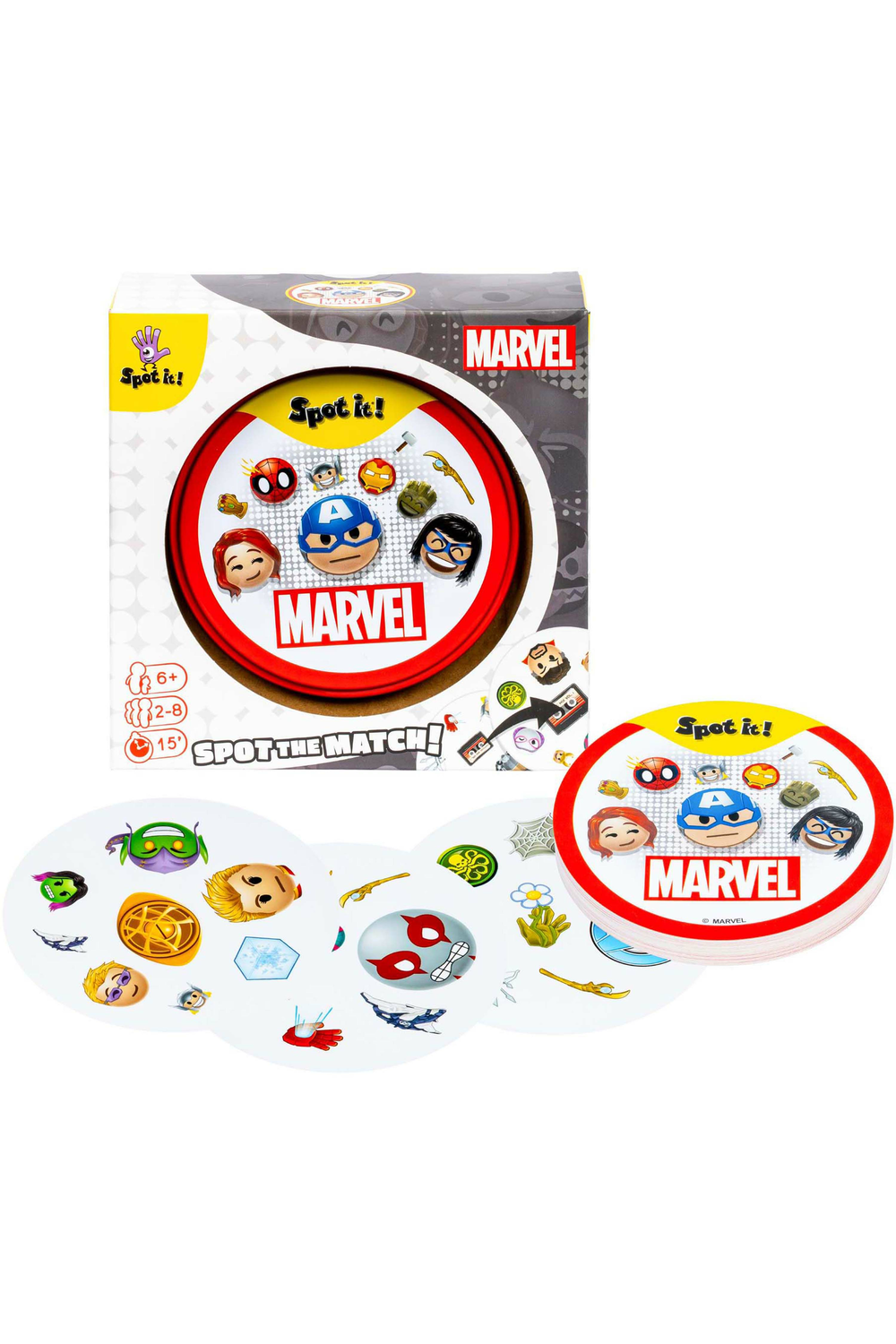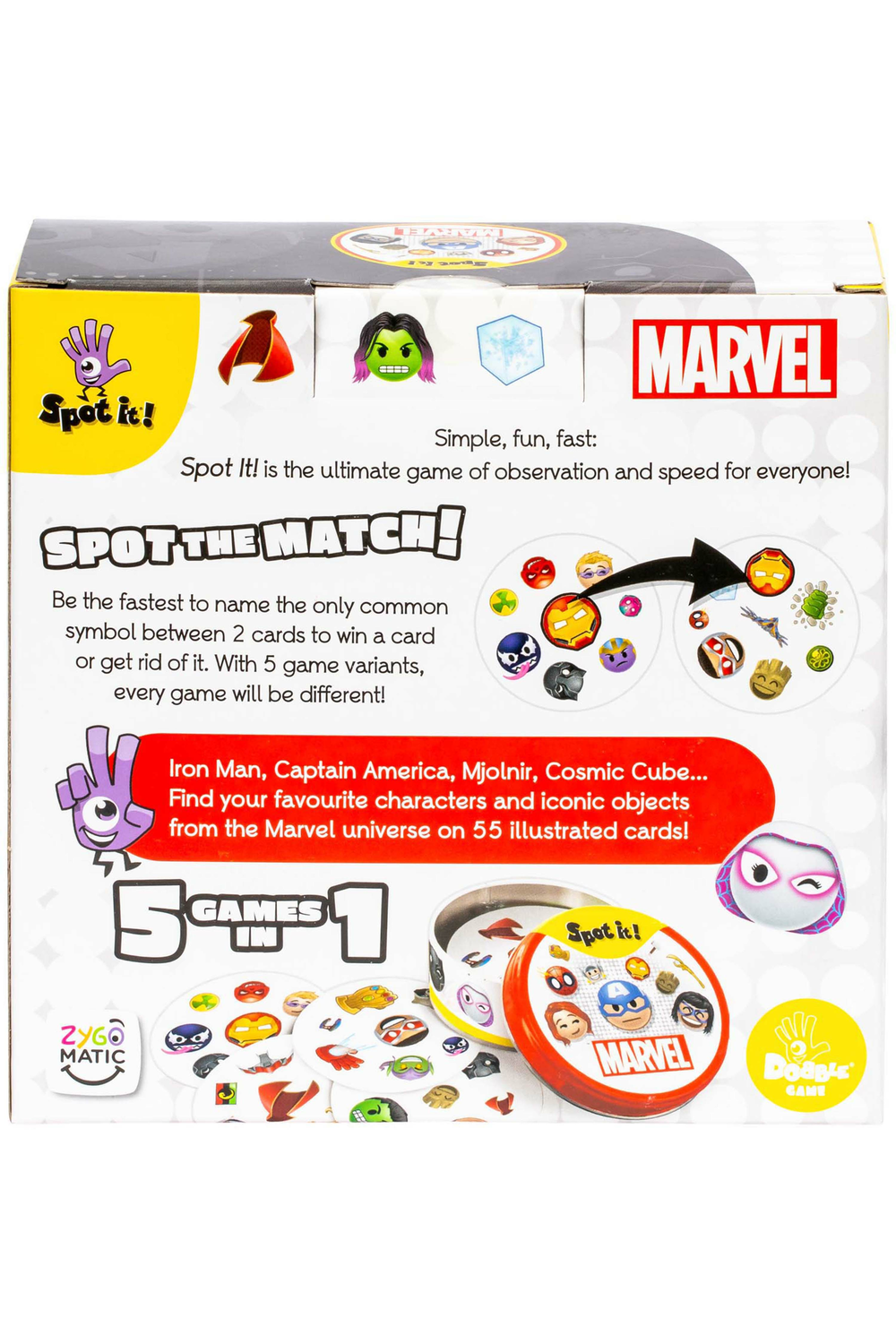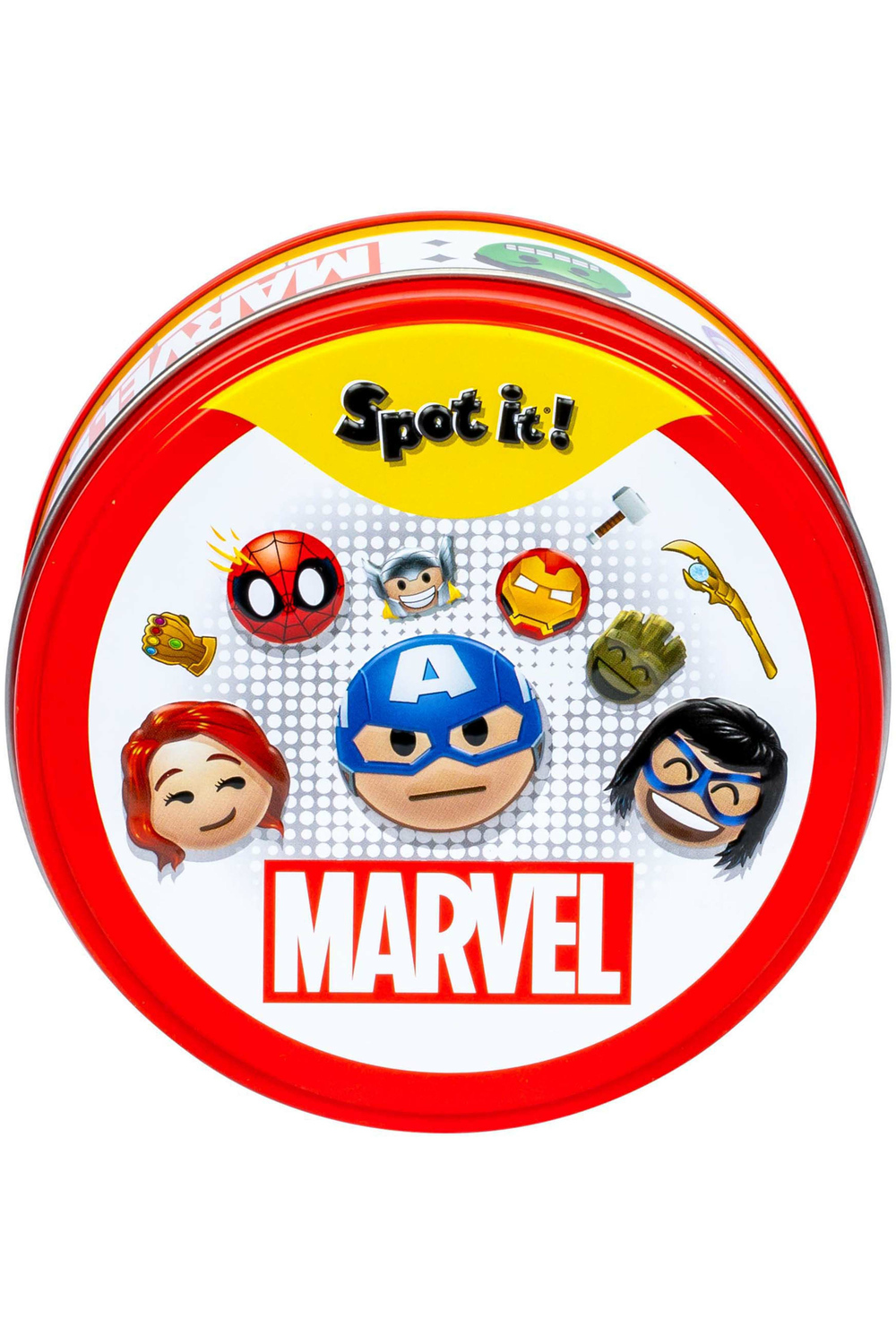 Now children can spot their favourite Marvel characters in this new release of this special Marvel edition of the classic "Spot It" game! This fast-paced fun family game of observation and quick reflexes is ideal for players aged 6 and up. Be the first to spot the only matching Marvel character symbols between two cards to win! Spot some of your favourite Marvel Characters like Iron Man, Captain America, Cosmic Cube and more. Cards come in a keep safe "Spot It" tin. Includes 55 playing cards and is a great game for 2-8 players, making it the perfect party game!
