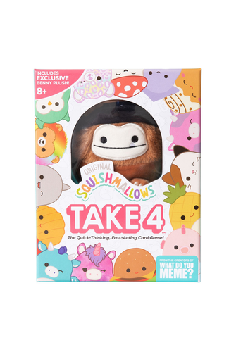 Grow your Squishmallows Squad with this fun and fast family game! Featuring an exclusive Benny The Bigfoot Squishmallow, Squishmallows: Take 4 is the ultimate game for anyone obsessed with Squishmallows. Your mission is to gather 4 cards from the same Squishmallows Squad. But watch out - if you try to grab the same one as another player, you both have to race to grab the mini Benny The Bigfoot in the centre in order to claim the card. It's a total blast, so play with your friends, family, kids, or anyone looking for a little Squishmallows fun.- Ages 14+