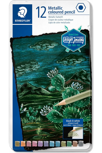 Staedtler Design Journey pencils come in a metal case containing 12 metallic coloured pencils in assorted colours. They are high-quality coloured pencils in classic hexagonal shape and soft lead for a wide range of dry techniques in bright colours and highly pigmented shades that are easy to blend. The casing of these colouring pencils comes from PEFC-certified, sustainably managed forests.