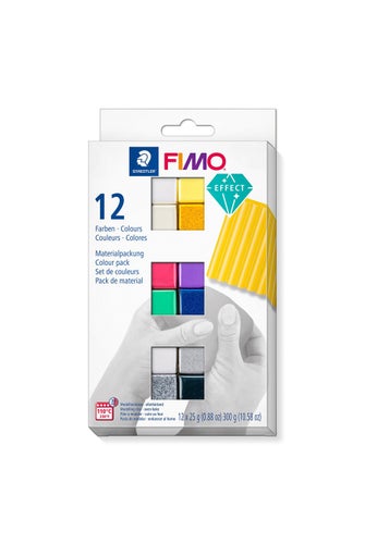 Fimo Soft Modelling Clay is particularly smooth and easy to use. These 12 half blocks of soft condition effect coloured modelling clay is ideal for children to use, creative ideas can be modelled into shape in no time at all, then oven-hardened to finish. Get inspired by the wide range of colours and discover your creativity! This set makes a wonderful starter set and includes 10x 25g coloured clay blocks that you can mould into designs of your choice. Colours: Translucent Yellow, Metallic Gold, Translucent White, Translucent Red, Glitter Blue, Nightglow, Translucent Green, Glitter White, Translucent Purple, Stone Granite, Glitter Silver, Stone Stardust