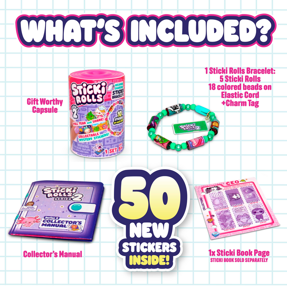 Each Sticki Band bracelet holds 5 rolls of stickers, each containing 10 unique, Kawaii-themed designs, making it easy to pull, twist, and stick. Two additional MYSTERY REVEAL Sticki Rolls inside for a total of 70 Stickers included! Decorate your phone, water bottle, or laptop, or trade them with friends to build your collections. With our unique Quick-Grip Clasp system, swapping out sticker rolls is a breeze, ensuring endless customization possibilities. Perfect for all ages 5 and up, Sticki Rolls are the first-ever wearable, shareable sticker bracelets!