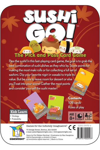 Pass the sushi! In this fast-playing card game, the goal is to grab the best combination of sushi dishes as they whiz by. Score points for making the most maki rolls or for collecting a full set of sashimi. Dip your favourite nigiri in wasabi to triple its value. But be sure to leave room for dessert or else you'll eat into your score! Gather the most points and consider yourself the sushi master!