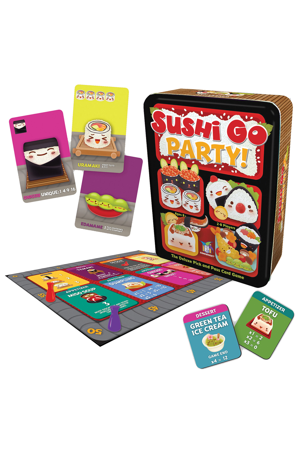 Sushi Go Party!, an expanded version of the best-selling card game Sushi Go!, is a party platter of mega maki, super sashimi, and endless edamame. You still earn points by picking winning sushi combos, but now you can customise each game by choosing a la carte from a menu of more than twenty delectable dishes. What's more, up to eight players can join in on the sushi-feast.