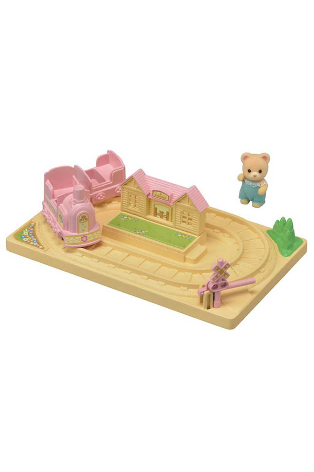 - Contents: Baby Choo-Choo Train set with 2 cars, 1 figure: Bear Baby, 1 movable railroad crossing gate