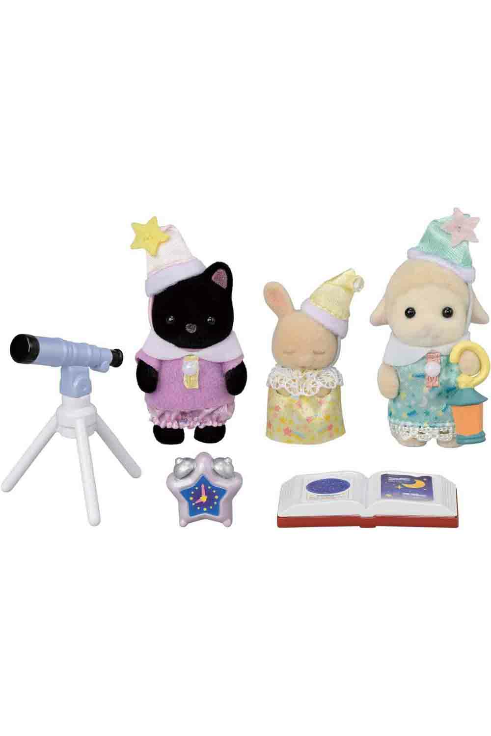 Nursery Friends - Sleepover Trio is the perfect addition to your nursery collections! Create fun scenes of the babies stargazing while on a sleepover party using the telescope and constellation book. Gloria Midnight Cat baby, Emma Dale Sheep Baby, and Iris Milk Rabbit Baby are all dressed in the new adorable pajamas with cute star patterns ready to search for the stars! Their lantern is also the perfect accessory to be able to find their way through the dark nights, along with their telescope and constellation book.