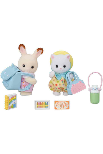 Let's walk to school with the Sylvanian Families babies! Chocolate Rabbit baby Creme and Persian Cat baby Ryan are eager and ready to go in this adorable new set with everything the babies need for a walk along to nursery. Including a number of fun play accessories, such as a rucksack, hat and water bottle this set makes a perfect addition to any nursery playset and can be used with other Sylvanian Families baby figures. Combine with the Sunny Castle Nursery set or the Rainbow Fun Nursery Bus set (both sold separately) for hours more role play fun.