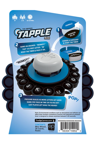 The #1 viral party game... to go! Tapple Mini is the portable version of the award-winning, fast-paced word game that has sold millions of copies worldwide! Small in size but big in fun, Tapple Mini is the perfect game to play on the go or bring on your next trip. Fast-paced word game now in a compact, portable version - perfect for travel and on-the-go fun! Features 36 category cards that fit in the tactile pop wheel for endless replayability and excitement. Great for families, novelty gifts, or classrooms - keeps kids engaged while building vocabulary skills. Pop the letters and race the timer - easy to learn, thrilling to play, and addictive to master! Small enough to toss in a bag but packed with big fun - perfect gift for game lovers of all ages!